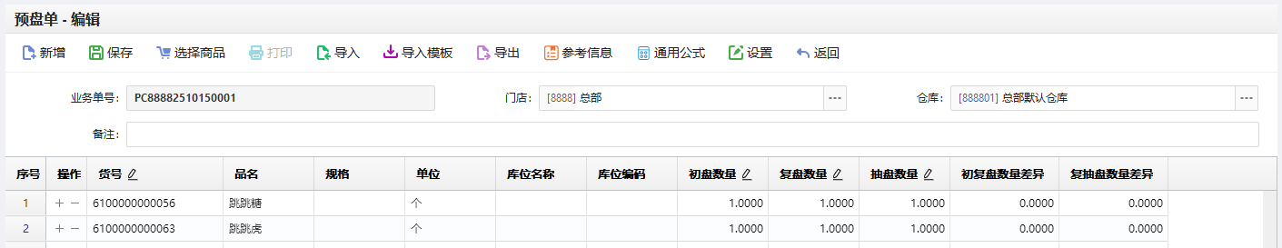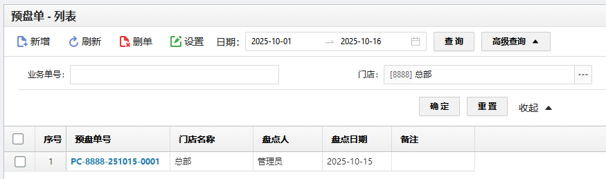 预盘单是用于商品初盘、复盘、抽盘数据记录与数量差异比较(此步骤可省略,跳过去直接做库存盘点单)。 位置:【营运】-> 【库管】-> 【盘点业务】 预盘单 - 列表默认显示 当月 预盘单单据,不区分单据状态; 如图所示 预盘单 - 单据在预盘单单据新增界面,录入/导入商品初盘、复盘、抽盘数据,保存即可生效。 如图所示 文档更新时间: 2025-10-16 07:40 作者:lixq