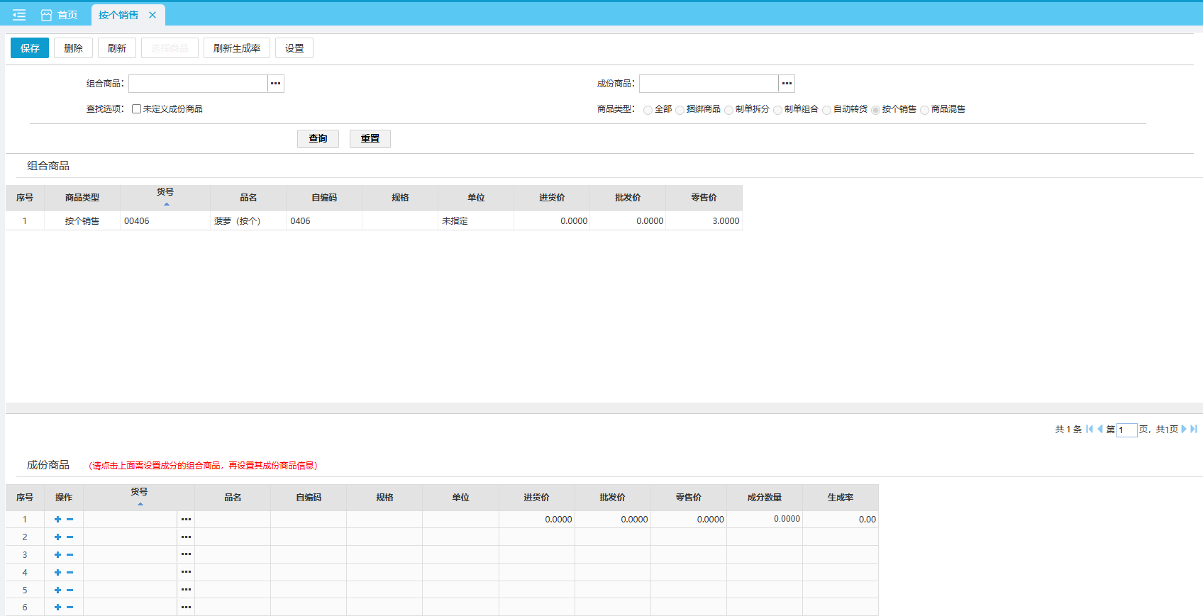 3、在按个销售界面,选中组合商品中的 按个销售(菠萝);