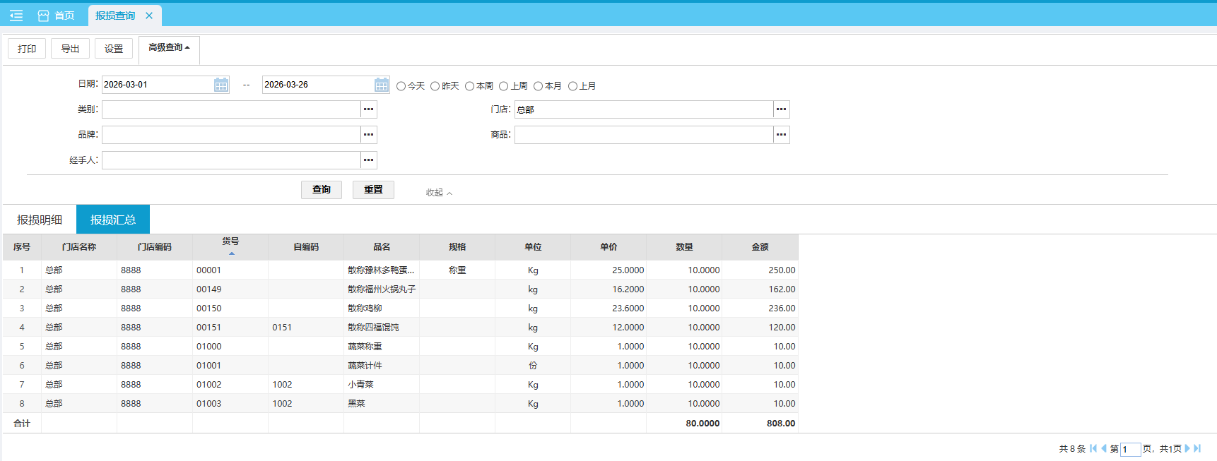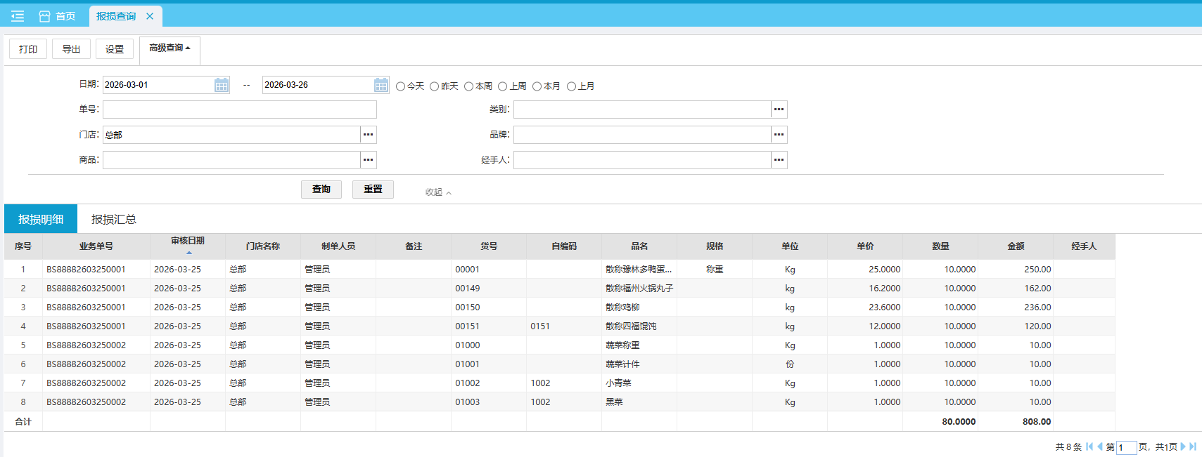 报损查询报表用于查询报损数据,报损查询分为报损明细和报损汇总两个报表。 位置:【营运】-> 【库管】-> 【业务查询】 报损明细默认查询当月 各单据的报损明细数据。 总部 默认查询本门店数据,支持查询所有门店的数据,分店仅可查询本门店的数据。 如图所示 报损汇总默认查询当月 各商品的报损汇总数据。 总部 默认查询本门店数据,支持查询所有门店的数据,分店仅可查询本门店的数据。 如图所示 文档更新时间: 2026-03-26 02:07 作者:zhangyi