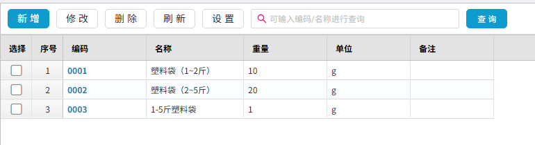 (2)后台点新增,设置编码,名称,重量。注:本设置仅支持总部设置(不支持门店设置)