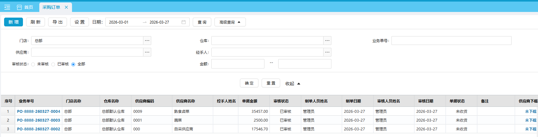 采购订单是商户根据商品库存、销售情况等因素制定采购订货计划,并下达至供应商按订单预先准备货品,以使商户能快速采购所需要的商品。