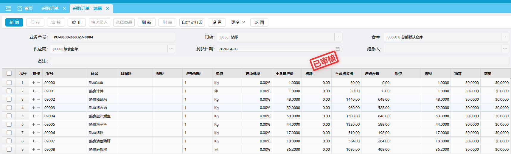 商品采购订货,选择订货的门店、仓库、供应商等信息,录入/导入订货的商品和数量,保存审核即可生效。