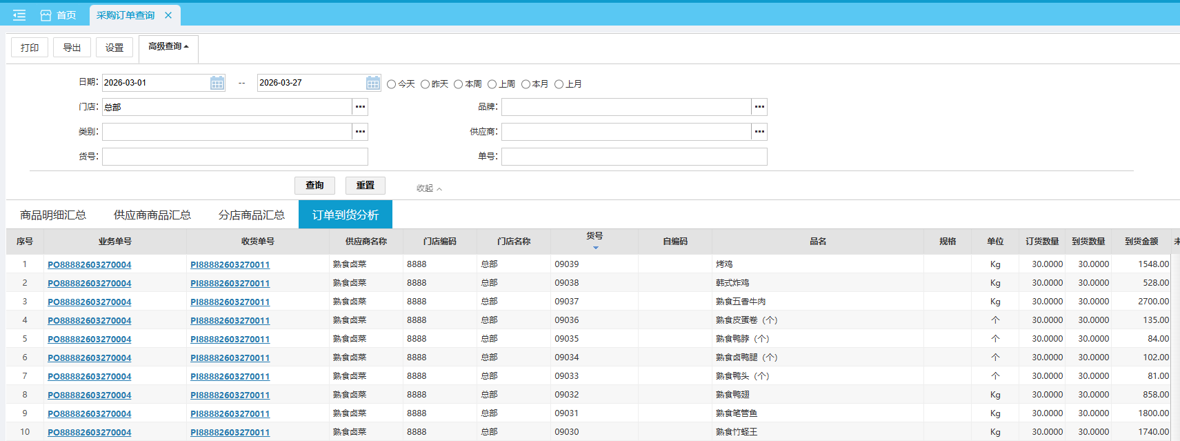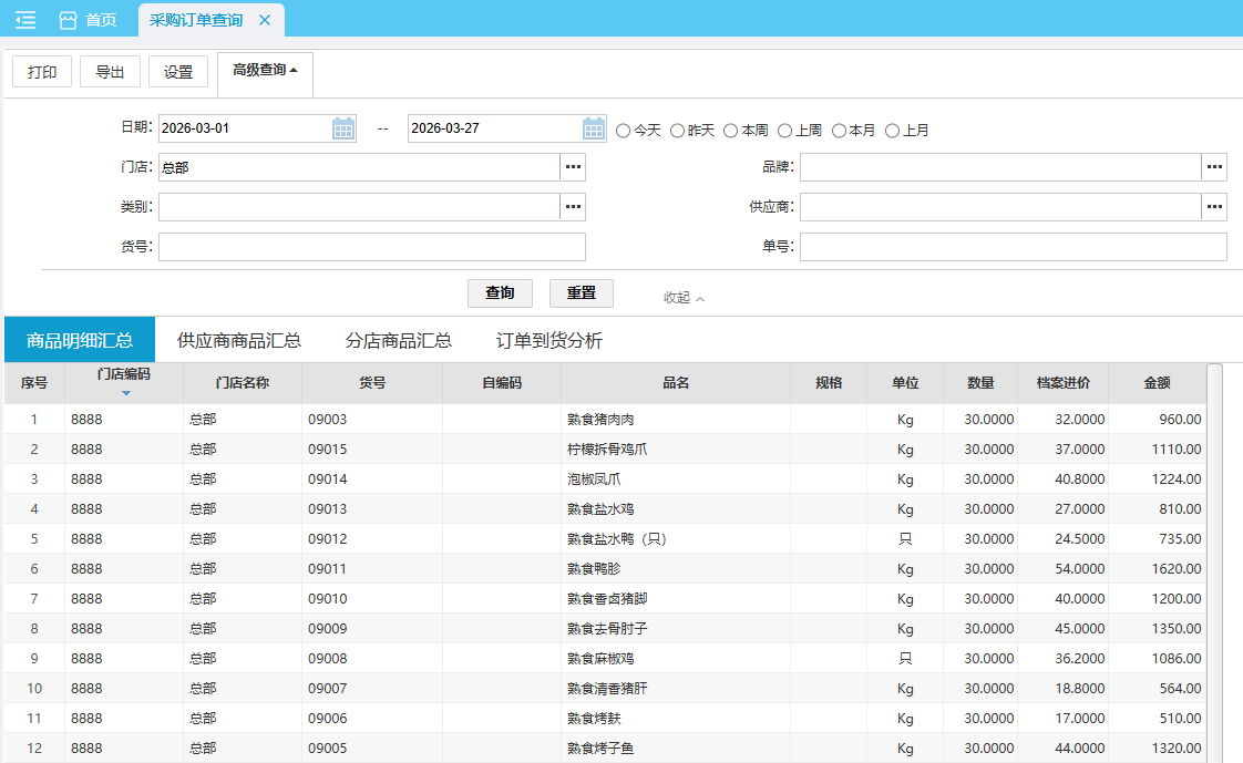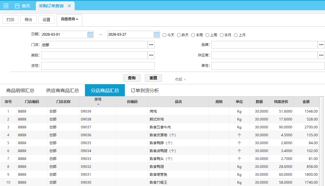 默认查询近本月 各采购订单各门店的采购明细汇总数据。