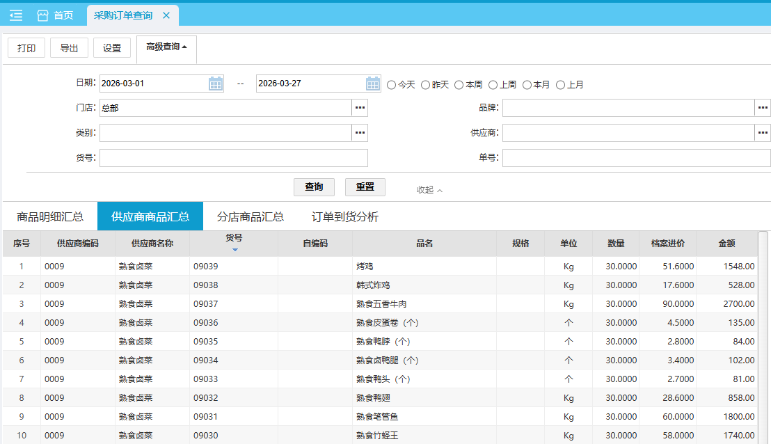 默认查询本月 各采购订单各供应商的采购明细汇总数据。