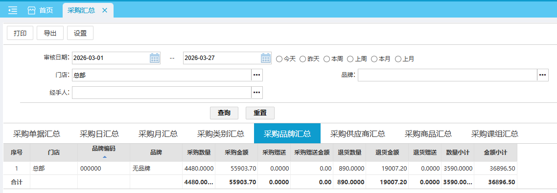 默认查询近本月 各品牌的采购汇总数据。