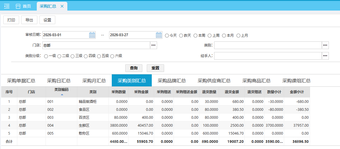 默认查询近本月 各类别的采购汇总数据,支持按六级类别进行汇总。