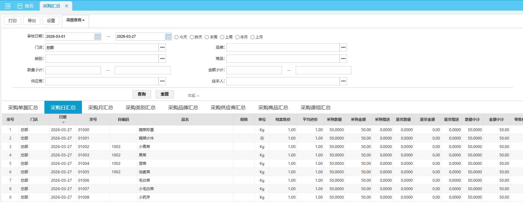 默认查询近本月 按日统计各商品采购汇总数据。