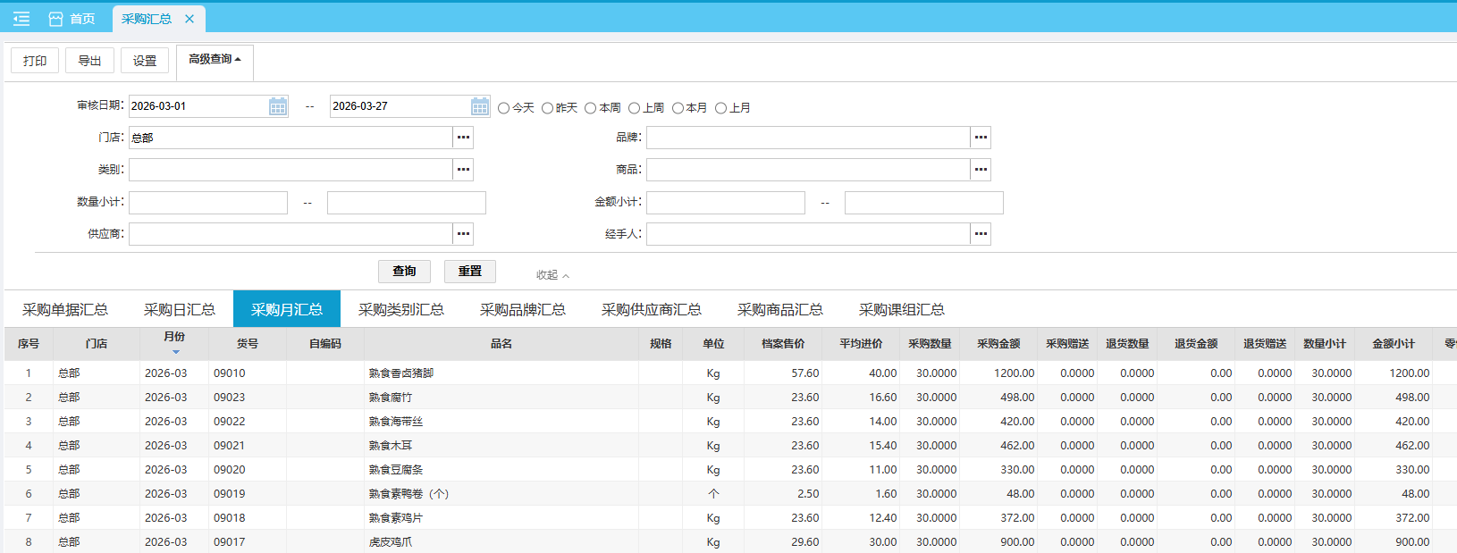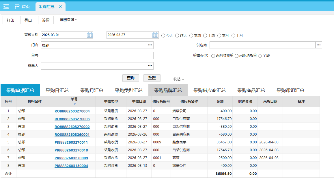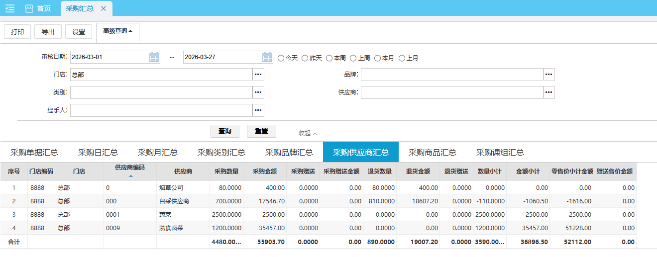 采购汇总报表可查询各门店对供应商采购的详细情况。