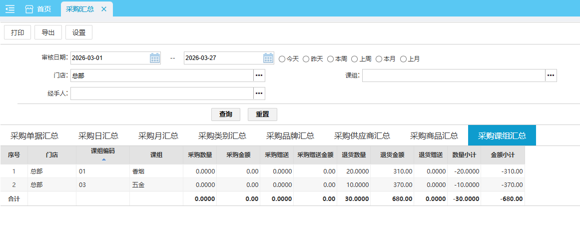 默认查询近本月 各课组的采购汇总数据。