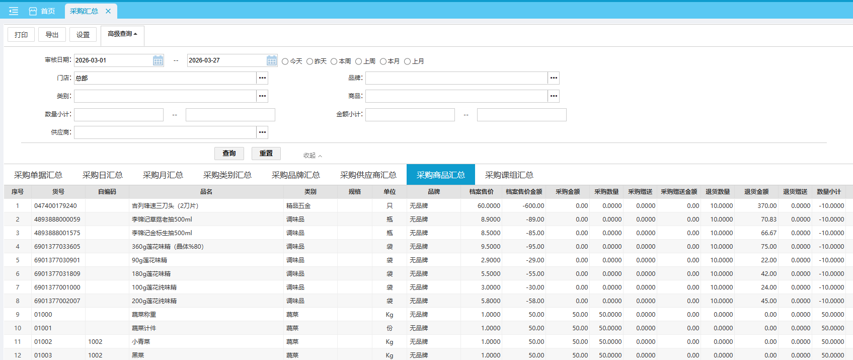 默认查询近本月 各商品的采购汇总数据。