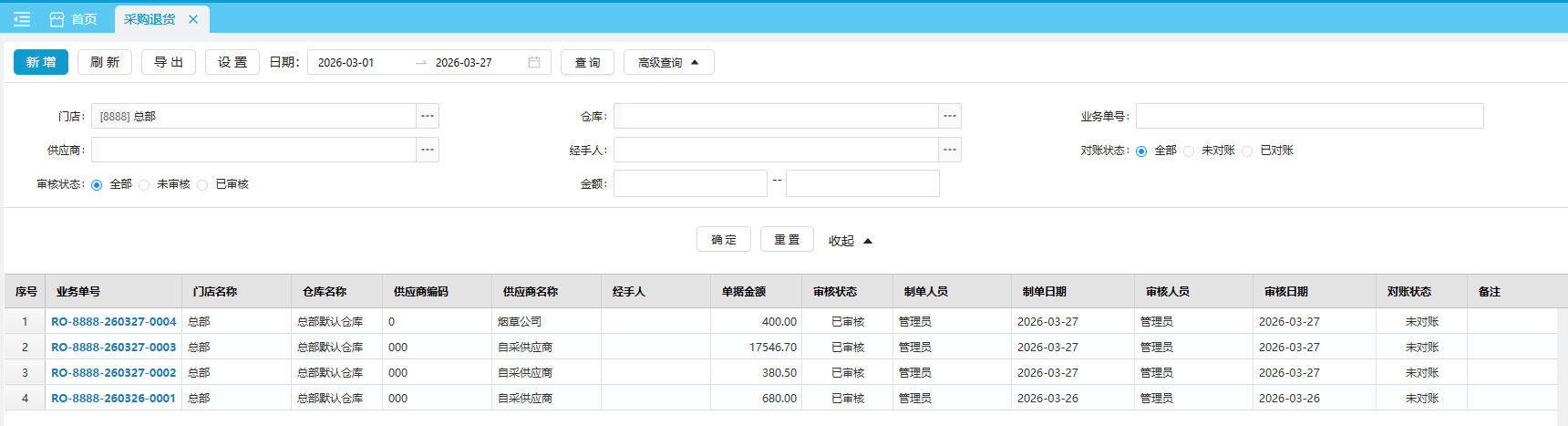 (3)在该界面审核状态分为已审核和未审核,未审核的单据会有红色背景标识。
