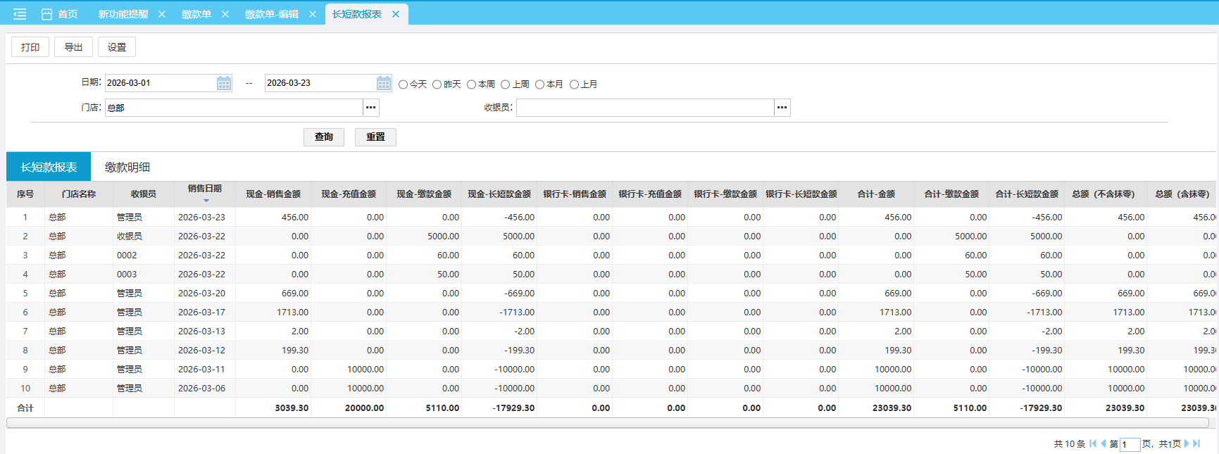 位置:【营运】-> 【卖场】-> 【交班对账】 #查询每天现金/银行卡销售和充值 和缴款单现金/银行卡金额是否相符。 (1)时间筛选:默认查询当前月份数据(2)数据默认不显示,需点击“查询”按钮 如图所示 缴款明细查询缴款单的明细数据。 (1)时间筛选:默认查询当前月份数据(2)数据默认不显示,需点击“查询”按钮 如图所示 文档更新时间: 2026-03-23 02:24 作者:zhangyi