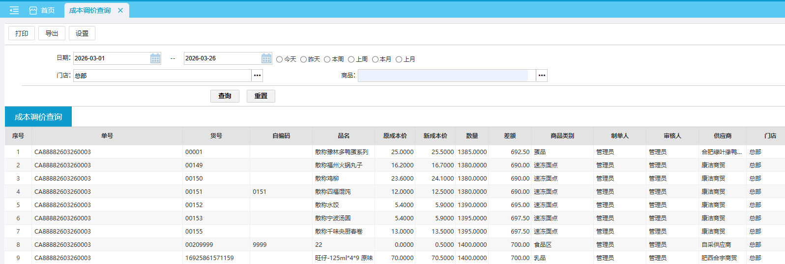 成本调价查询报表用于查询成本调价的明细数据。 位置:【营运】-> 【库管】-> 【业务查询】 #默认查询当月 各单据的成本调价明细数据。 如图所示 总部 默认查询本门店数据,支持查询所有门店的数据,分店仅可查询本门店的数据。 文档更新时间: 2026-03-26 03:00 作者:zhangyi