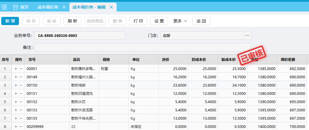 成本调价,选择需要调价的门店,录入/导入需进行成本调价的商品和新成本价,保存审核即可生效。