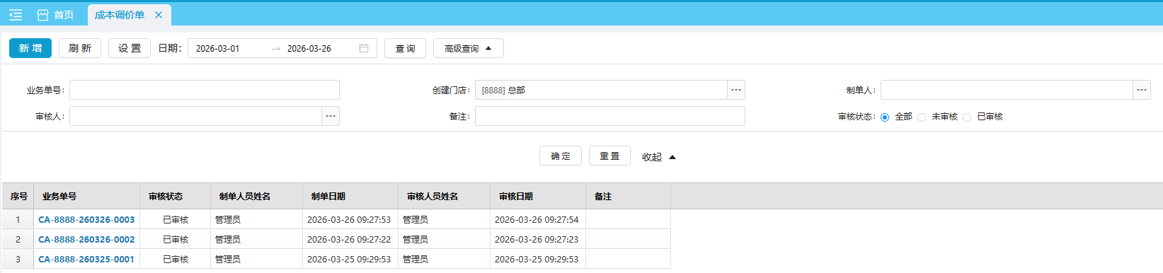 总部 默认查看本门店的成本调价单,总部也可查看其他门店的单据;分部 查看本门店的成本调价单单据。
