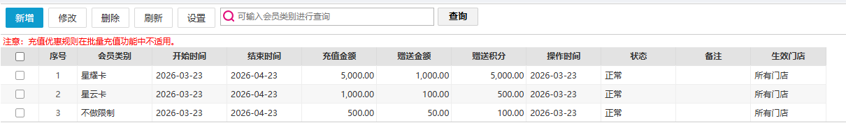 会员类别:针对特定会员类别定制充值优惠,只需选定类别,该类别下的会员将遵循所设规则;选择“不限制”选项则使得所有会员类别都能享受通用的充值规则