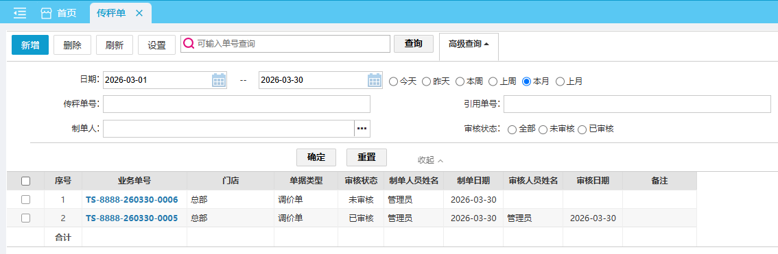 (2)总部 可查看到所有门店传称单;分部 仅可查看到当前门店的单据