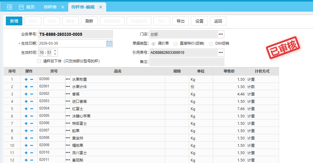 通过做传称单设定生效时间,在指定时间自动下传称重商品价格到对应的条码秤上;支持总部替门店做单;