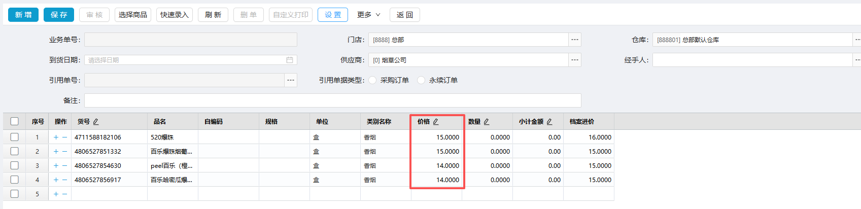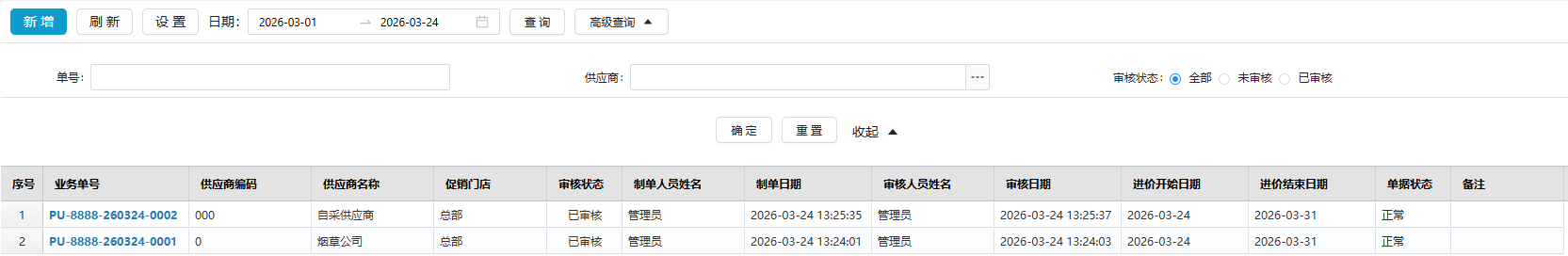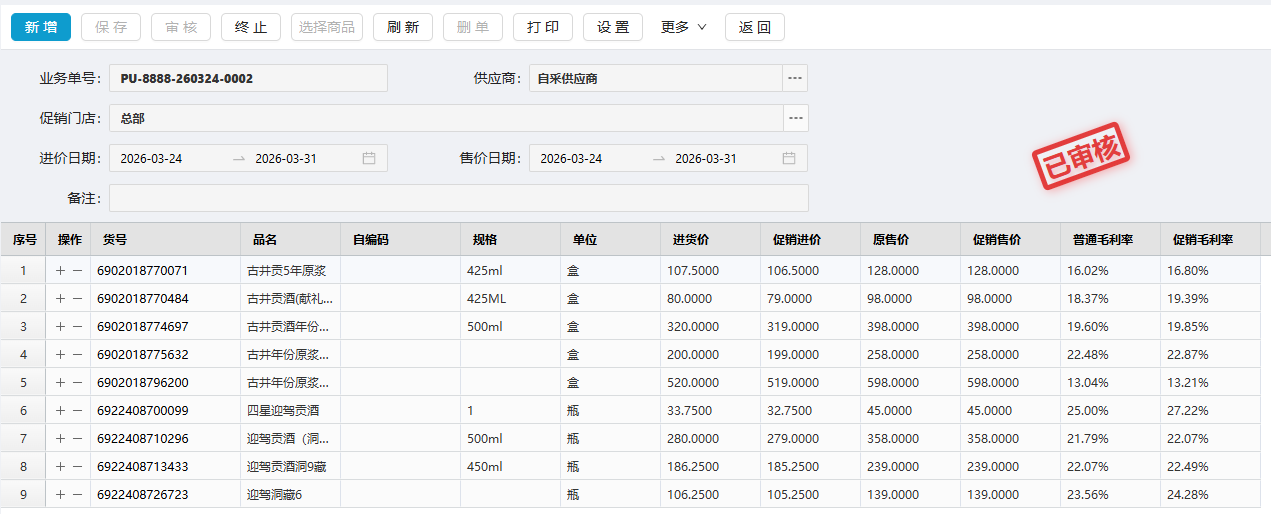 促销进价单审核后,在促销期间,采购订单/采购收货/采购退货等单据中,会自动获取商品的促销进价: