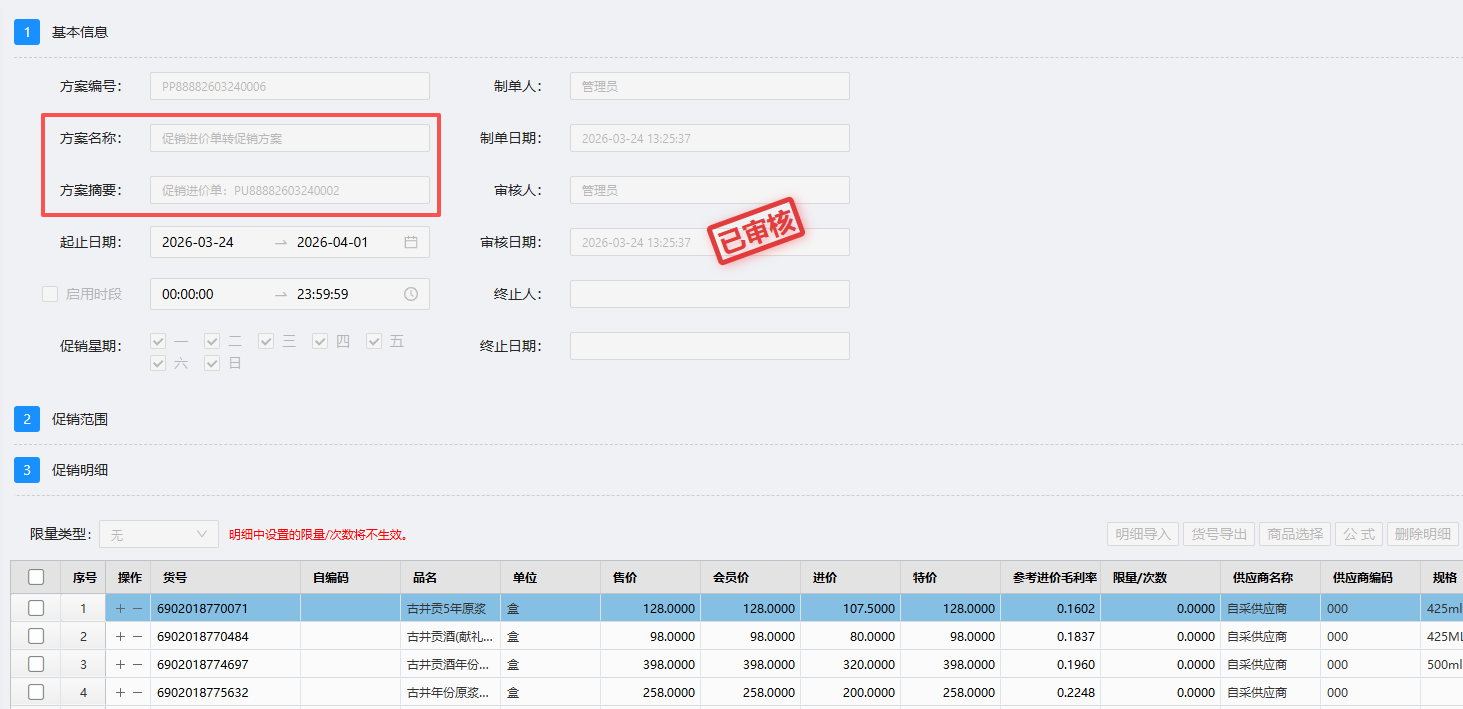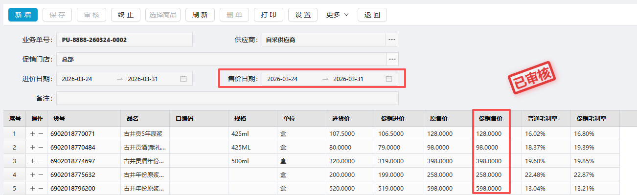 (3)促销进价单审核后,会自动生成直接特价单。