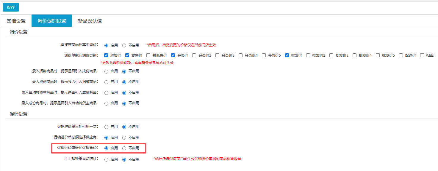 (1)在【商品设置】的“调价促销设置”中默认启用了促销进价维护促销售价。