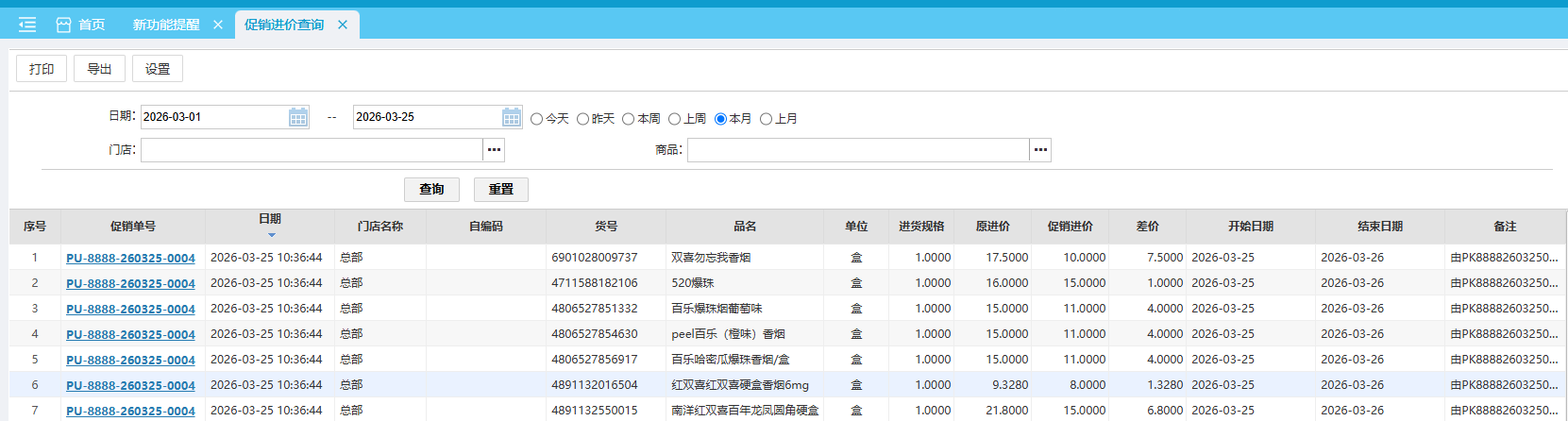促销进价查询可用于查询当前促销进价商品的明细数据。 位置:【营运】->【促销】->【促销查询】 点击促销进价单单号,会跳转到促销进价单详情界面。 如图所示 文档更新时间: 2026-03-25 02:40 作者:zhangyi