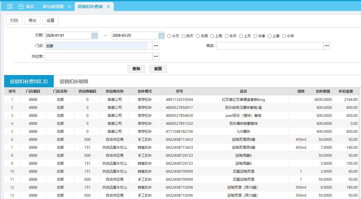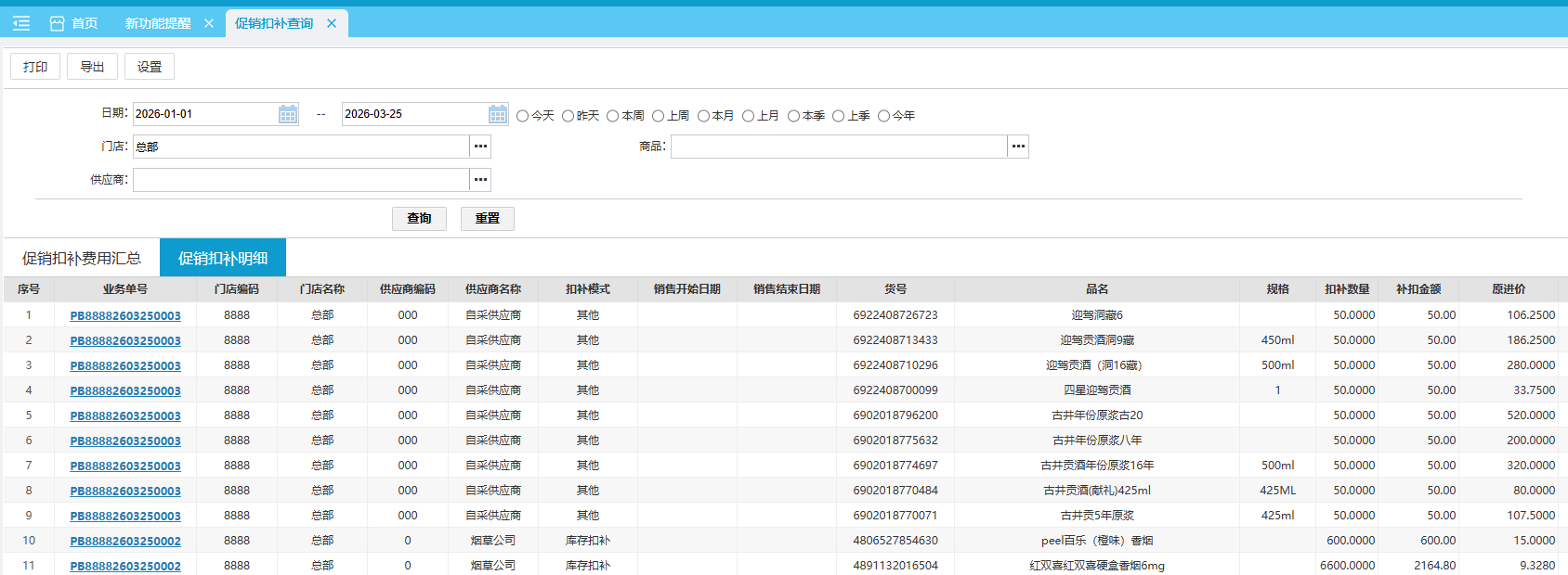 促销扣补查询可用于查询已做促销扣补的商品明细。 位置:【营运】->【促销】->【促销查询】 促销扣补费用汇总 各商品的扣补汇总数据。 如图所示 促销扣补明细 点击业务单号,会跳转到促销扣补单详情界面。 如图所示 文档更新时间: 2026-03-25 02:47 作者:zhangyi