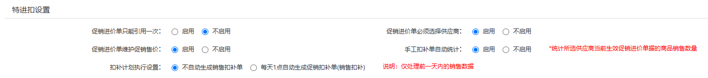 促销进价单只能引用一次:启用后,促销扣补单引用过一次的促销进价单无法再次被引用。