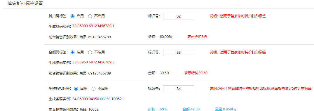 默认不启用,启用情况下, 可以修改标识号: ; 说明:适用于管店临时生鲜折扣打印标签,商品货号限定5位计重商品生成条码实例