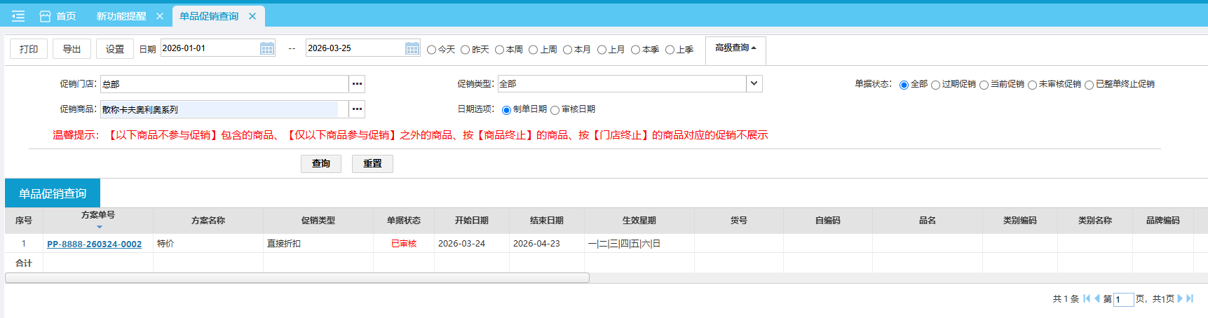 单品促销查询 可按照商品进行查询是否参与促销计划。 位置:【营运】->【促销】->【促销查询】->【单品促销查询】 (1)点击业务单号,会跳转到促销单详情界面。(2)【以下商品不参与促销】包含的商品、【仅以下商品参与促销】之外的商品、按【商品终止】的商品、按【门店终止】的商品对应的促销不展示(3)必须输入商品信息 如图所示 文档更新时间: 2026-03-25 03:22 作者:sundl