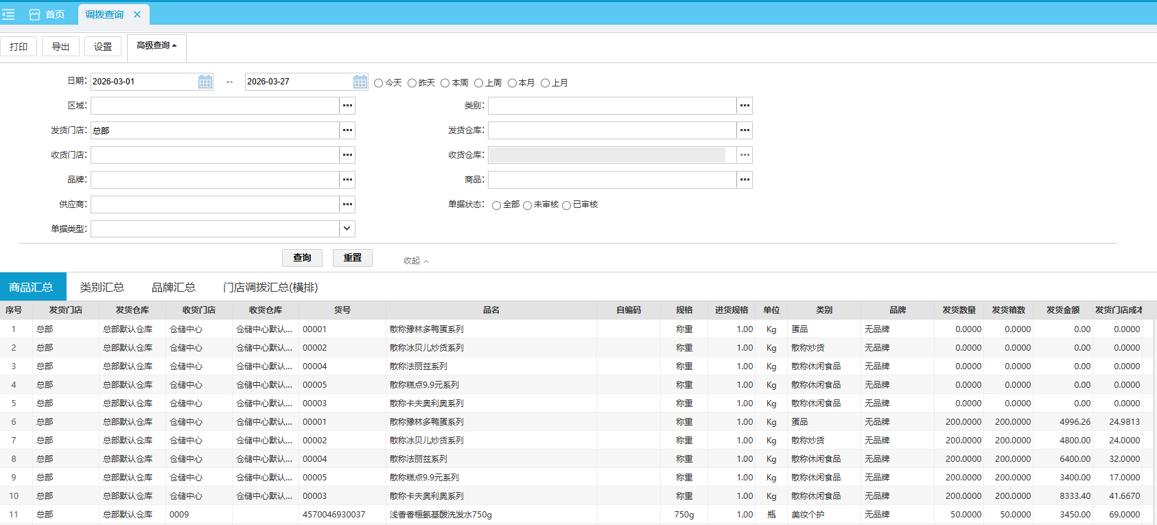 默认查询本月 各门店各商品的调拨情况。