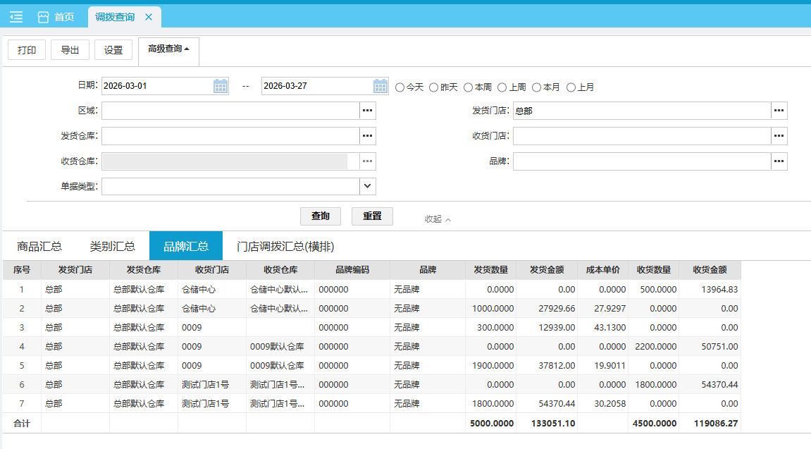 默认查询本月 各门店各品牌的调拨情况。