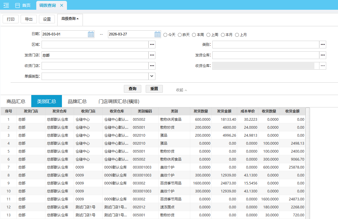 默认查询本月 各门店各类别的调拨情况。