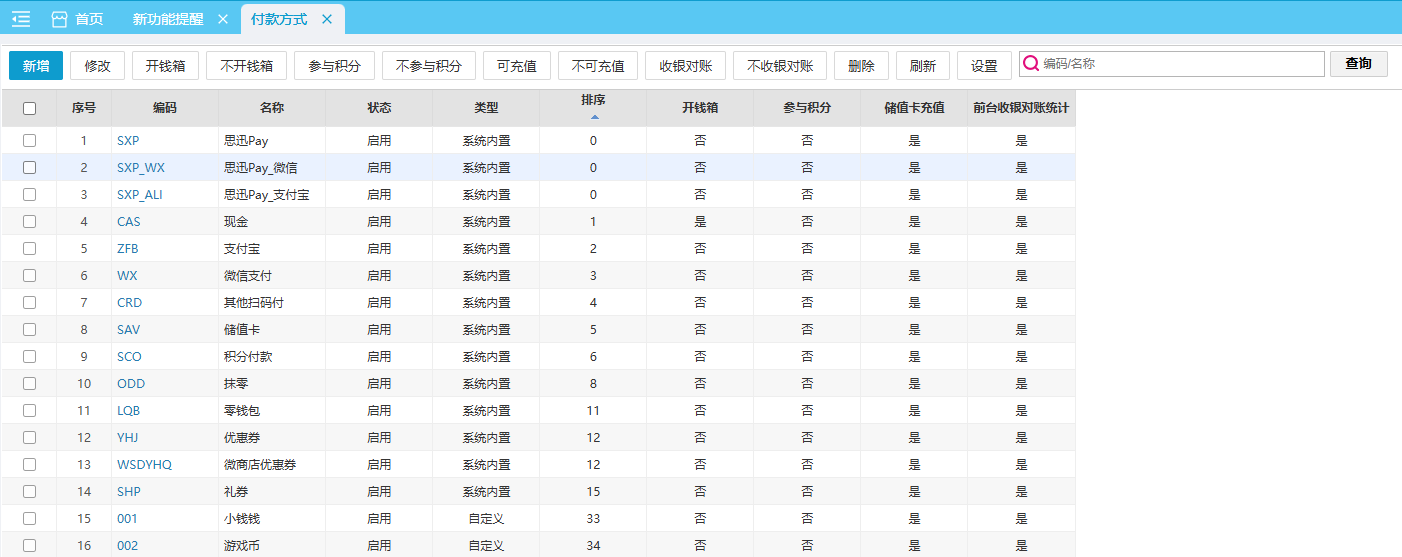位置:【营运】-> 【卖场】-> 【基础信息】概述:付款方式包含系统内置付款方式、自定义付款方式;可设置按照付款方式开启钱箱/参与积分 如图所示 (1)系统内置的付款方式不允许修改;(2)自定义付款方式在前台结算-更多功能里面;(3)选择付款方式,开关钱箱操作(4)选择付款方式,是否参与积分计算(4)选择付款方式,是否参与储值充值 文档更新时间: 2026-03-20 06:27 作者:zhangyi
