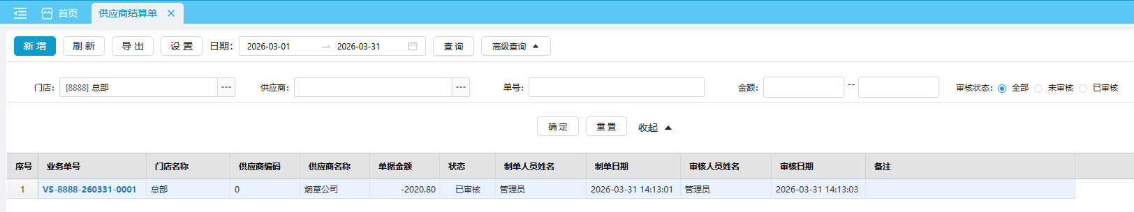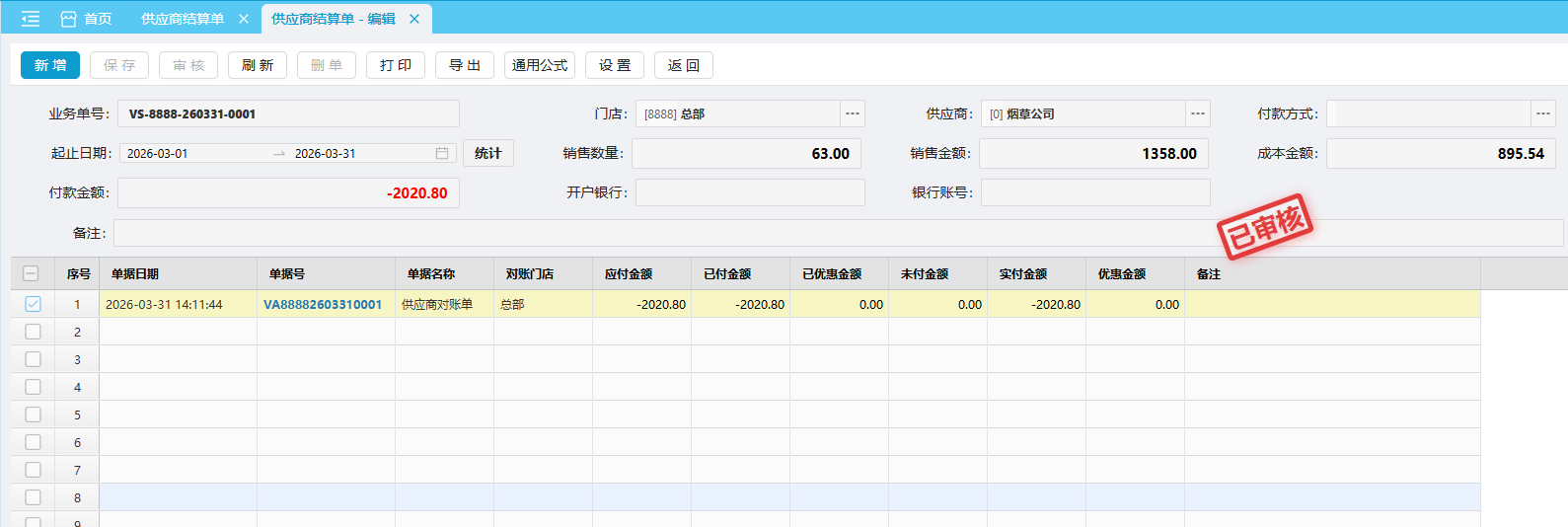 供应商结算单中选择供应商信息,付款方式、结算门店、选择结算统计时间,点击统计,会自动统计供应商已审核的对账单单据,录入实付金额或优惠金额,保存审核即可生效。