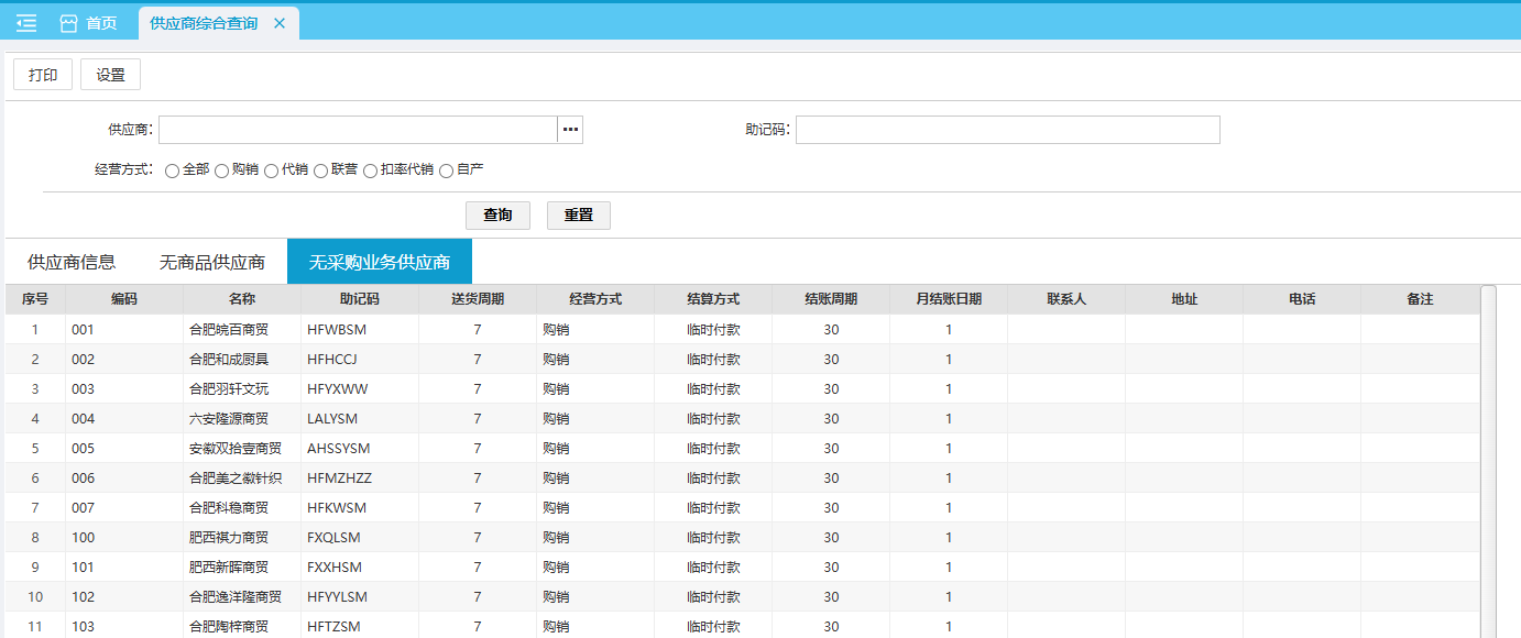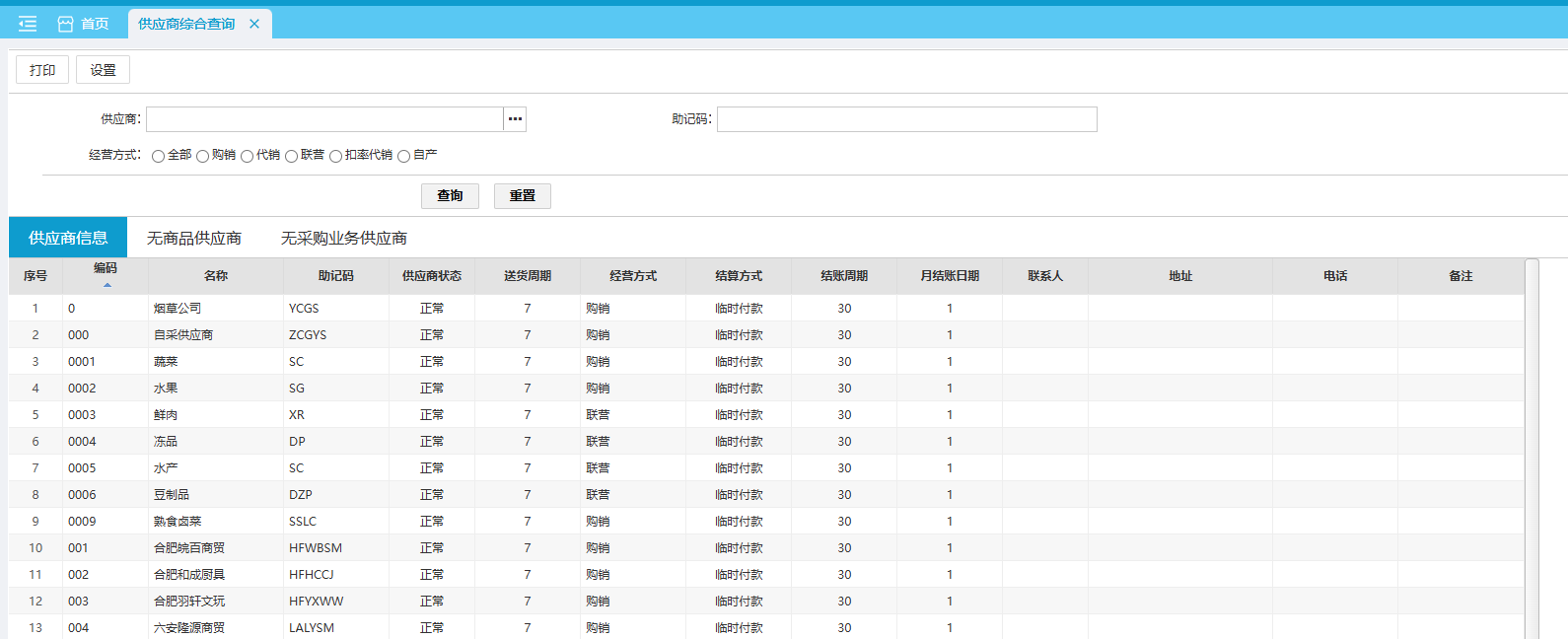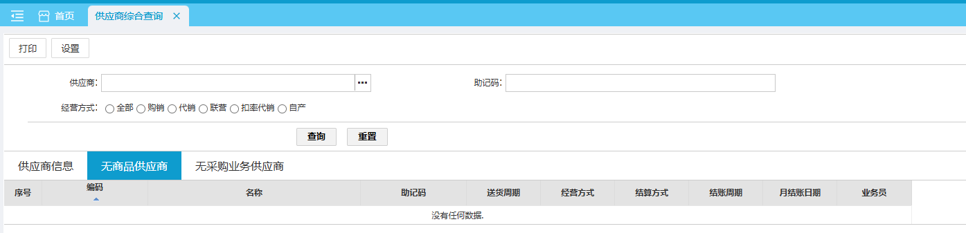 供应商信息无商品供应商无采购业务供应商 供应商综合查询报表用于查看供应商相关信息,便于分析供应商的详细情况。 位置:【采配】-> 【采购查询】-> 【采购汇总】 供应商信息默认查询商户所有的供应商信息。 如图所示 无商品供应商默认查询无商品的所有供应商信息。 如图所示 无采购业务供应商默认查询未采购过的所有供应商信息。 如图所示 文档更新时间: 2026-03-27 03:25 作者:zhangyi