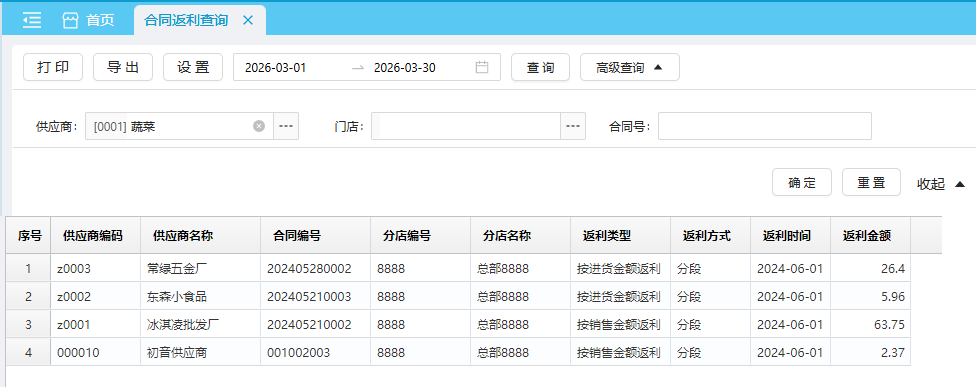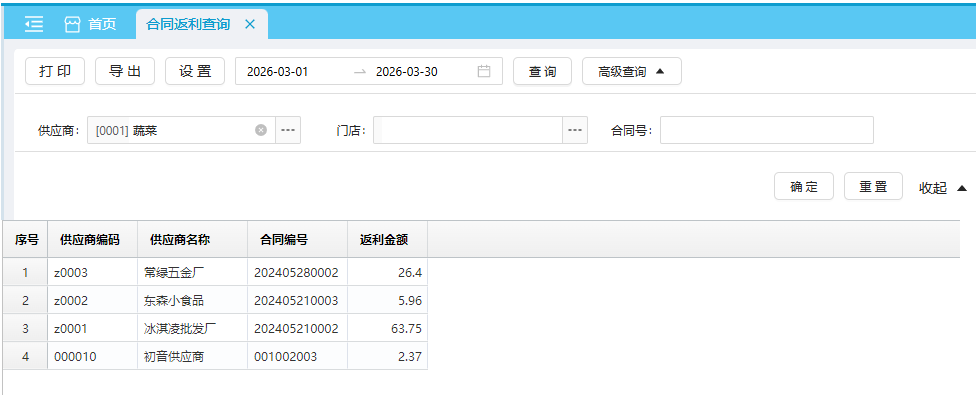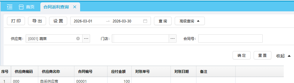 返利汇总返利明细合同费用 合同返利查询可用于查看供应商合同的返利情况,可通过右上角切换报表,包含返利汇总、返利明细以及合同费用三个报表。 位置:【财务】-> 【合同】-> 【合同管理】 返利汇总默认查询近本月 各供应商各合同的返利汇总数据。 如图所示 返利明细默认查询近本月 各供应商各合同的返利明细数据。 如图所示 合同费用默认查询近本月 各供应商各合同的费用明细数据。 如图所示 文档更新时间: 2026-03-30 07:12 作者:zhangyi