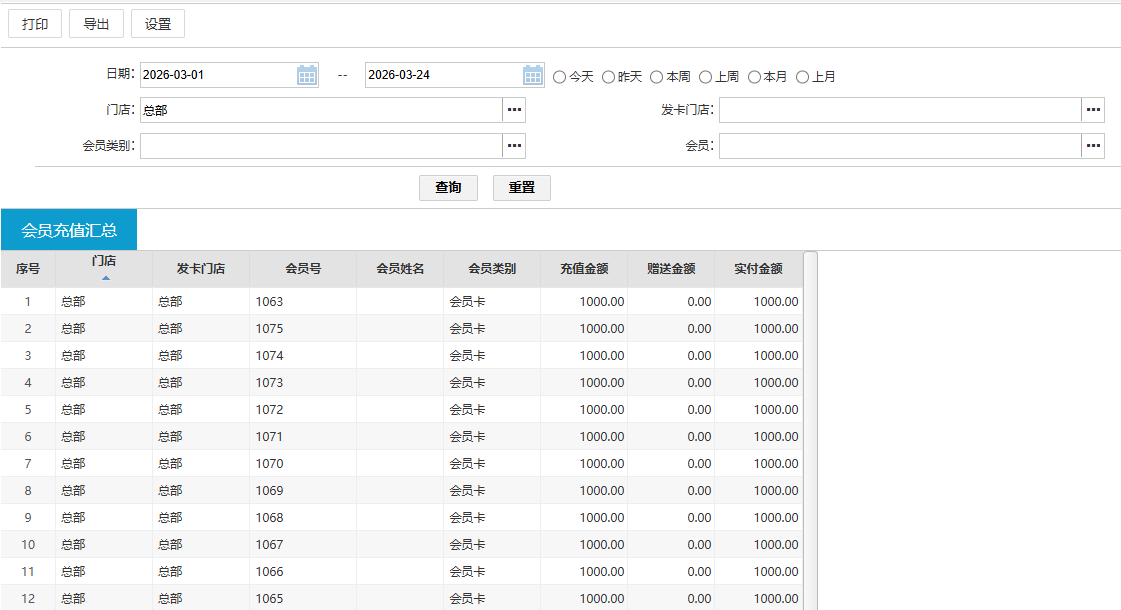 位置:【会员】-> 【会员查询】-> 【会员充值汇总】 #按照 会员 查询 会员充值 数据汇总。 如图所示 (1)默认显示 当月 查询(2)如需设置字段显示格式,可点击【设置】(3)支持打印和导出 操作(4)数据来源:初始导入/线下消费端操作的储值变动(5)总部可查询所有门店的充值记录,分店仅可查询当前登录工号所在门店充值记录(6)数据默认不显示,如需查询 需点击“查询”按钮 文档更新时间: 2026-03-24 01:16 作者:zhangyi