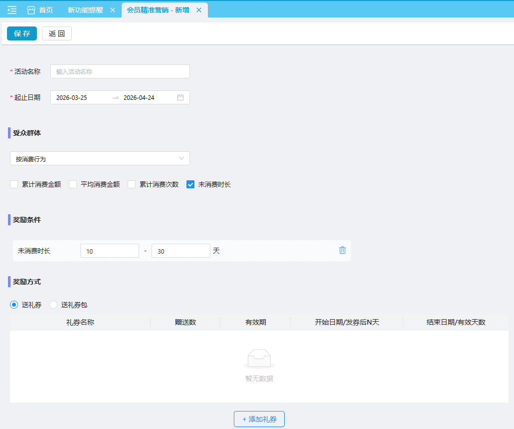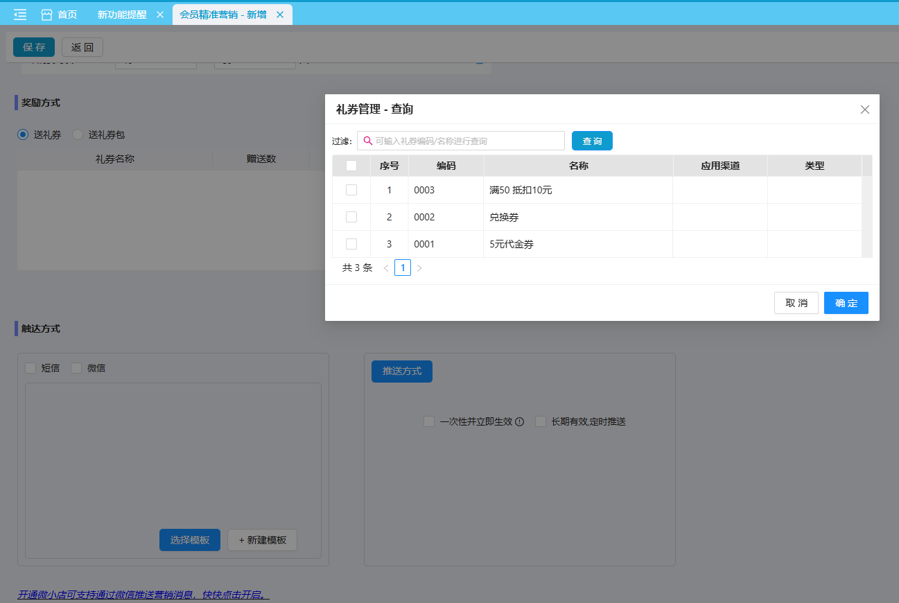 - 活动明细:线下礼券、线下礼包或营销短信,选择礼券/礼包需要选择对应的礼券/礼包,选择营销短信,可以编辑短信内容给会员发送短信。