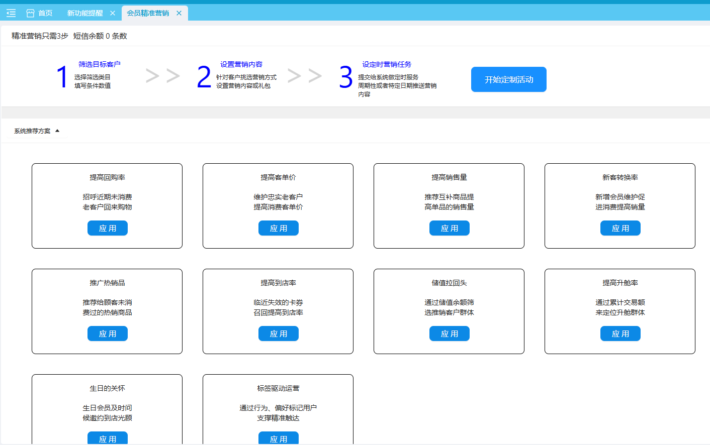 系统提供9种推荐方案:提高回购率、提高客单价、提高销售量、新客转换率、推广热销品、提高到店率、储值拉回头、提高升舱率、生日的关怀,可以直接选择这些推荐方案,快速实现会员精准营销。