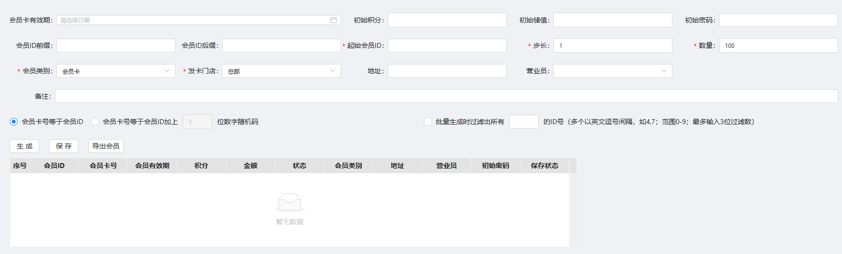 用于系统批量生成多个会员账户信息,适用于门店大规模会员招募场景。