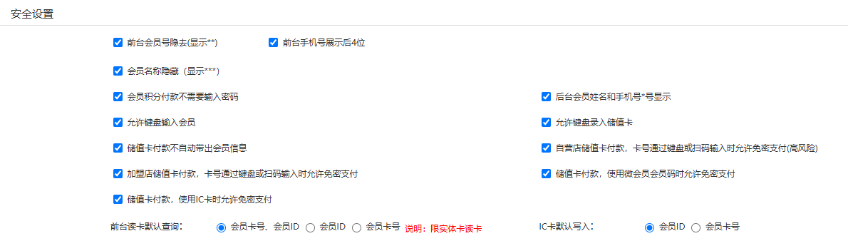 前台手机号展示后4位 :为确保会员信息安全,勾选设置后, 前台 会员信息查询、收银及副屏展示和小票打印时,会员号、手机号和姓名将自动部分遮掩为星号。