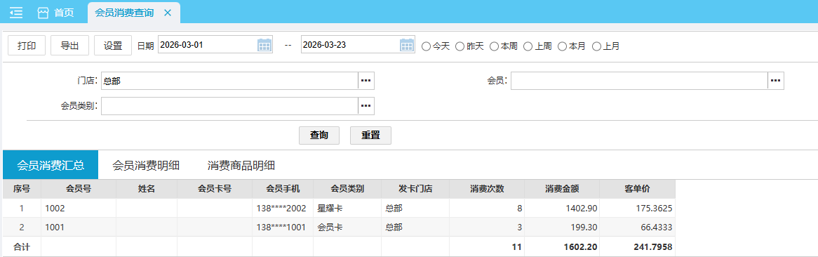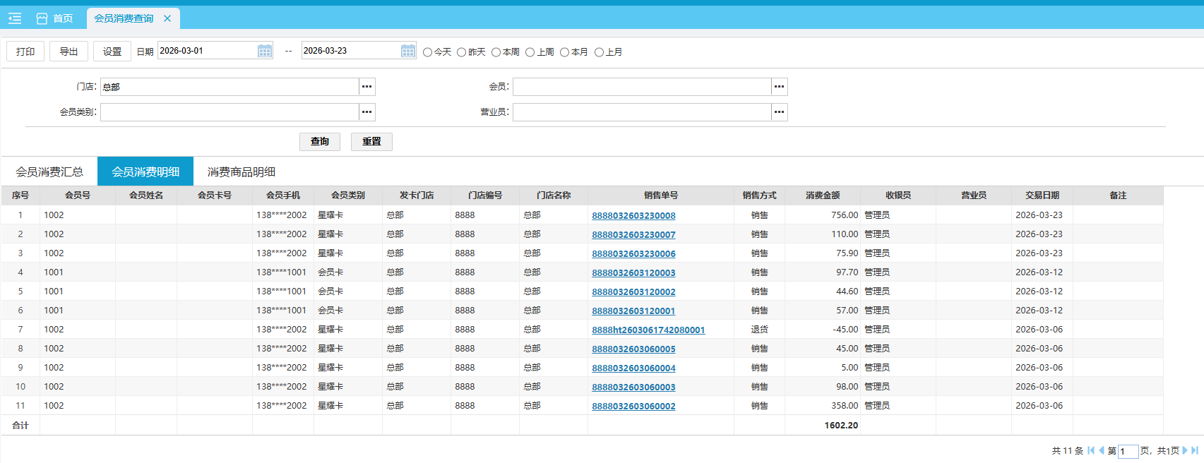位置:【会员】-> 【会员查询】-> 【会员消费明细】