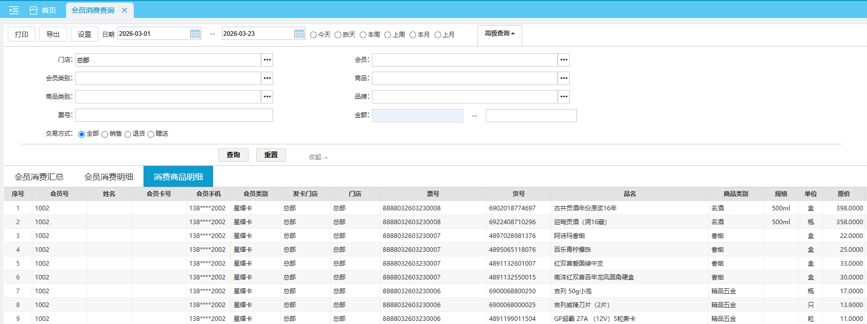 按照 消费门店 & 会员 查询 商品消费 数据明细
