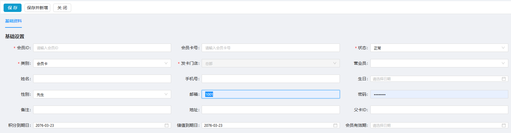 新增:进行单个会员新增操作;如需批量新增,请前往 〖基础数据导入〗 选择< 会员档案 >进行导入 或者〖会员批量制卡〗 进行操作