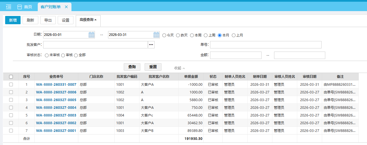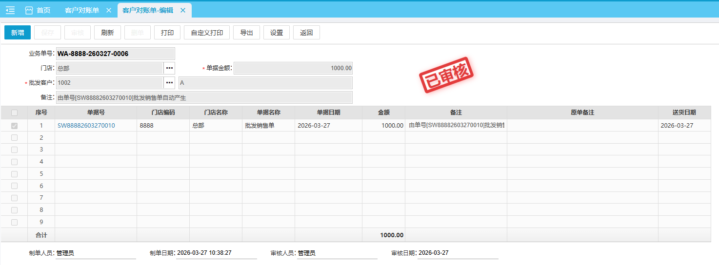客户对账单中选择批发客户信息,选择对账统计时间,点击统计,会自动统计批发客户所有未对账的业务单据,选择账款无误的单据,保存审核即可生效。