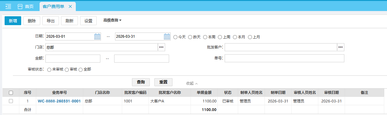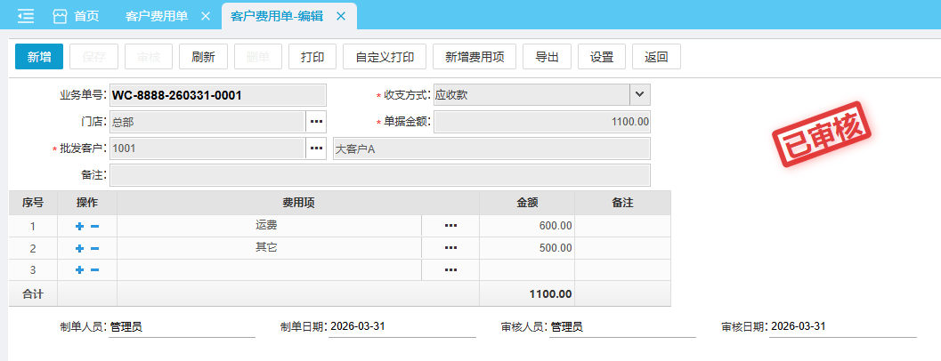 客户费用单是商家与批发客户之间非正常业务的费用清单,收支方式有两种:应收款、应付款这两种。