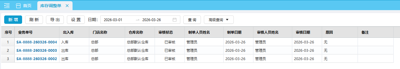 总部 默认查看本门店的库存调整单,总部也可查看其他门店的单据;分部 查看本门店的库存调整单据。