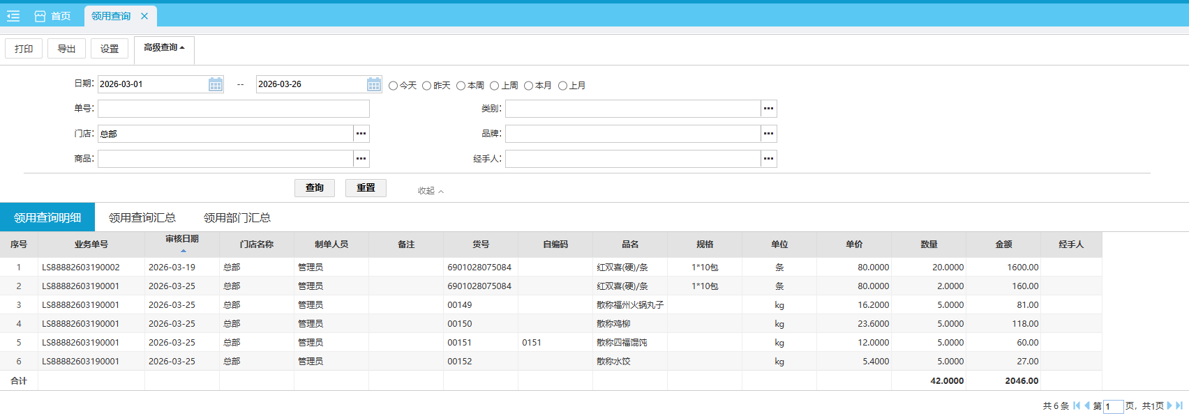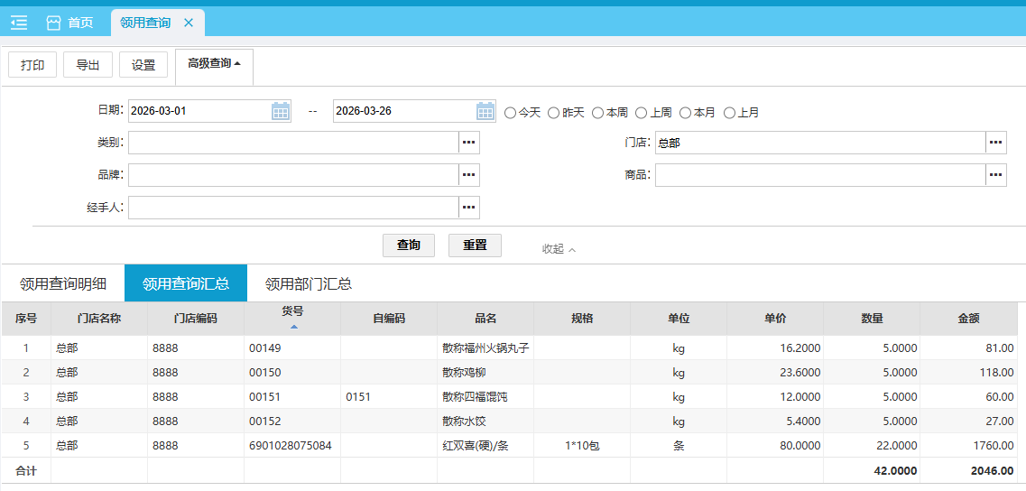 领用查询报表用于查询领用数据,领用查询分为领用明细和领用汇总两个报表。 位置:【营运】-> 【库管】-> 【业务查询】 领用查询明细默认查询当月 各单据的领用明细数据。 总部 默认查询本门店数据,支持查询所有门店的数据,分店仅可查询本门店的数据。 如图所示 领用查询汇总默认查询当月 各商品的领用汇总数据。 总部 默认查询本门店数据,支持查询所有门店的数据,分店仅可查询本门店的数据。 如图所示 文档更新时间: 2026-03-26 02:04 作者:zhangyi