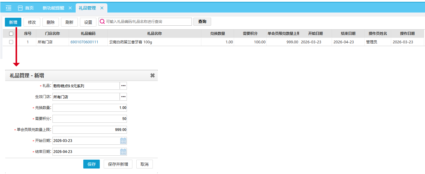位置:【会员】-> 【积分储值】-> 【礼品管理】